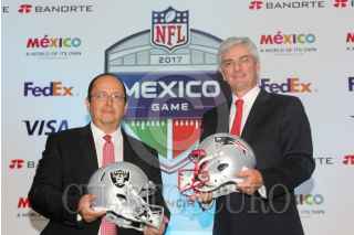CIUDAD DE MÉXICO, 10AGOSTO2017.- José Calatayud, director ejecutivo de mercadotecnia grupo financiero Banorte y Arturo Olivé, director NFL México, en conferencia de prensa anunciaron que el próximo 16 de agosto comenzará la venta de boletos para el público en general del partido Raiders contra Patriotas. El encuentro se llevará a cabo el 19 de noviembre en el Estadio Azteca. FOTO: GALO CAÑAS /CUARTOSCURO.COM