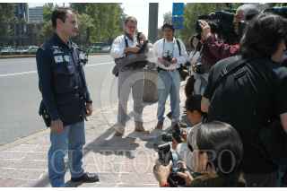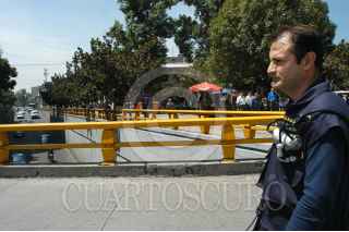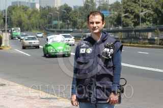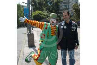 MEXDF 13JULIO2004.- La Secretaria de Salud, comenzo un programa de monitoreo de la contaminación. Un chaleco con diversos dispositivos de medición de las particulas contaminantes que hay en el medio ambiente seran usados por un grupo de adultos mayores. El payaso¨jaboncito Dicaprio¨ acompaña a Roman Rodriguez es un usuario del chaleco. FOTO: Germán Romero/CUARTOSCURO.COM