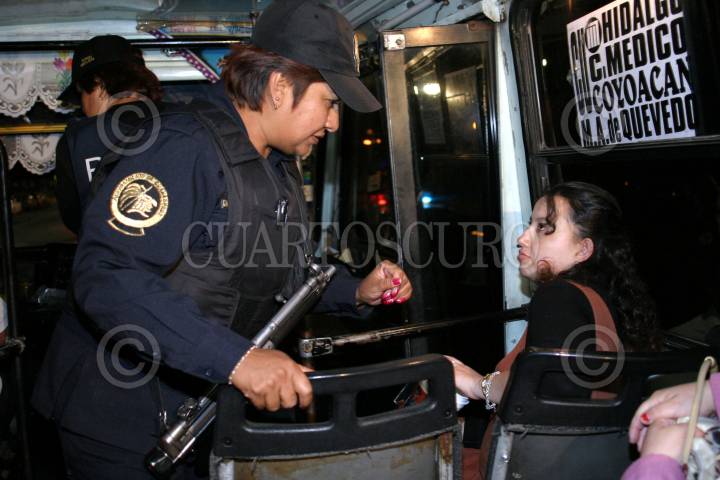 México, D.F., 13JULIO2004.- Una mujer policía revisa a los pasejeros de un microbús de la ruta que corre de Reforma-Bellas Artes, como parte del macrooperativo que coordina a organizaciones policiacas de diferentes estados de la República. FOTO: Moisés Pablo/CUARTOSCURO.COM
