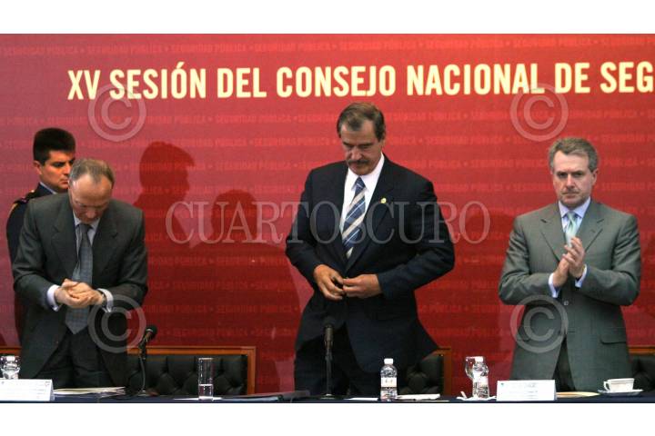 MEXDF14JULIO2004.- Alejandro Gertz Manero, secretario de seguridad pública junto con el presidente de México, Vicente Fox Quesada y el secretario de gobernación, Santiago Creel, durante la reunión de seguridad. FOTO: Sandra Perdomo/CUARTOSCURO.COM