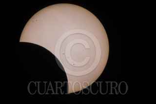 CIUDAD DE MÉXICO, 21AGOSTO2017.- En la Facultad de Ingeniería de la Universidad Nacional Autónoma de México, la Sociedad Astronómica (SAFIR), invitó a la comunidad estudiantil para observaran el eclipse en telescopios con filtros adecuados. En la imagen, el sol es obstaculizado por la luna en 38% de su circunferencia. FOTO: ADOLFO VLADIMIR /CUARTOSCURO.COM