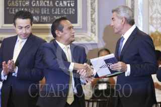 PUEBLA, PUEBLA 24AGOSTO2017.- El gobernador de Puebla; Antonio Gali, realizó la entrega de la Constitución Política del estado de Puebla traducida al náhuatl a Juan Gregorio Regino; director general del Instituto Nacional de Lenguas Indígenas para garantizar la ejecución de los derechos elementales a la población indígena en todas las regiones del estado. FOTO: HILDA RÍOS/ CUARTOSCURO.COM