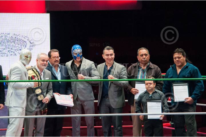 CIUDAD DE MÉXICO, 29AGOSTO2017.- Trabajadores y luchadores profesionales del Consejo Mundial de Lucha Libre (CMLL), participaron en una ceremonia de afiliación al Seguro Popular, organizada por la Comisión Nacional de Protección Social en Salud. Durante el evento, que se realizó en la Arena México, hubo una pelea entre Hechizero y El Valiente. FOTO: DIEGO SIMÓN SÁNCHEZ /CUARTOSCURO.COM