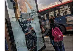 CIUDAD DE MÉXICO, 29AGOSTO2017.- Una mujer espera el trolebus frente a un anuncio publicitario, en una de las estaciones sobre Eje Central. FOTO: ISAAC ESQUIVEL /CUARTOSCURO.COM