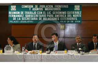 México, D.F. 26 JULIO 2004.- Al centro Gerónimo Gutierrez Hernández, secretario de Relaciones Exteriores de América del Norte, durante la reunión de trabajo sostenida con la comisión de población, fronteras y asuntos migratorios. FOTO: Sandra Perdomo/CUARTOSCURO.COM