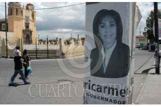TENANCINGO, TLAXCALA 27JULIO2004.- La candidatura de Maricarmen Ramirez a la gobernatura por el PRD, ha sido impugnada por sus contrincantes de partido. Denuncian diversas irregularidades. Un cartel anuncia la campaña poltica de la esposa del gobernador Sanchez Anaya. FOTO: Germàn Romero/CUARTOSCURO.COM
