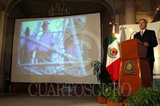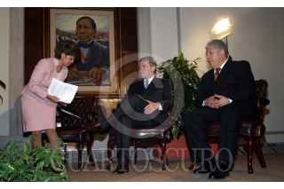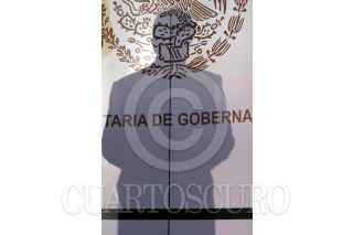 México, D.F. 27 JULIO 2004.- La sombra de Santiago Creel Miranda, secretario de Gobernación, en la conferencia con los reporteros de la fuente referentes, en donde respodio sobre el caso de delitos del pasado y la posible consignación de Luis Echeverría. FOTO: Sandra Perdomo/CUARTOSCURO.COM