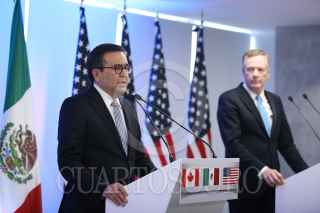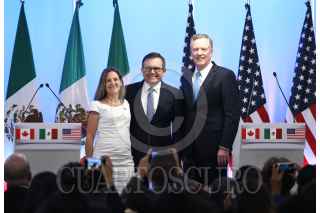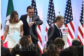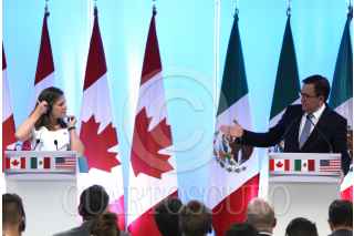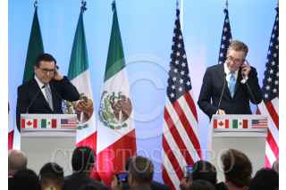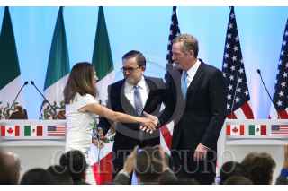 CIUDAD DE MÉXICO, 05SEPTIEMBRE2017.- Chrystia Freeland, Canciller de Canadá, Ildefonso Guajardo, secretario de Economía de México y Robert Lighthizer, representante de Comercio Exterior de los Estados Unidos, durante la conferencia de cierre de la "Segunda Ronda Negociaciones para la Modernización del Tratado de Libre Comercio de América del Norte". FOTO: ADOLFO VLADIMIR /CUARTOSCURO.COM