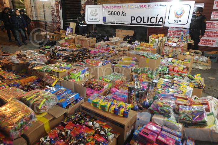CIUDAD DE MÉXICO., 12SEPTIEMBRE2107.- Mediante un operativo del grupo de fuerza de tarea de la SSP y el INVEA, se logró el decomiso de aproximadamente 5000 kilos de pirotecnia, que mantenían resguardada en una bodega ubicada en la calle 2ª de Roldan marcada con el número 22, en la colonia Centro, mismo que fue clausurado. El material asegurado fue transportado a las instalaciones de fuerza de tarea, en la calle de Piraña en la colonia Del Mar en Tláhuac, para su destrucción. FOTO: LUIS CARBAYO /CUARTOSCURO.COM