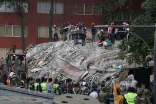 CIUDAD DE MÉXICO, 19SEPTIEMBRE2017.- Decenas de personas entre cuerpos de rescate y sociedad en general ayudan en las labores de rescate entre los escombros de edificios que colapsaron tras el fuerte sismo de 7.1 grados en escala de richter que se registró esta tarde en la Ciudad de México. En la imagen, un edificio derrumbado en Viaducto casi esquina con Medellin. FOTO: SAÚL LÓPEZ /CUARTOSCURO.COM