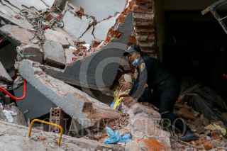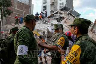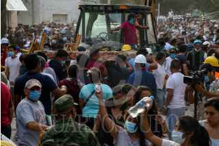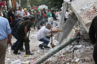 CIUDAD DE MÉXICO, 19SEPTIEMBRE2017.- Decenas de personas entre cuerpos de rescate y sociedad en general ayudan en las labores de rescate entre los escombros de edificios que colapsaron tras el fuerte sismo de 7.1 grados en escala de richter que se registró esta tarde en la Ciudad de México. En la imagen, un edificio derrumbado en la calle de Bretaña en la colonia Zacahuitzo en la delegación Benito Juarez. FOTO: SAÚL LÓPEZ /CUARTOSCURO.COM