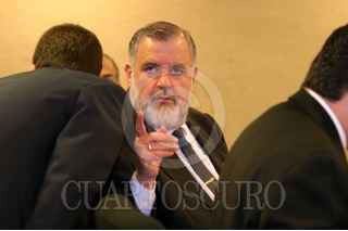 México, D.F. 16 AGOSTO 2004.- José Luis Soberanes, presidente de la CNDH, mientras observaba las imagenes de jovenes golpeados; al finalizar con el informe especial de los altermundistas detenidos en las manifestaciones de la III Cumbre Latinoamericana en Guadalajara. FOTO: Sandra Perdomo/CUARTOSCURO.COM