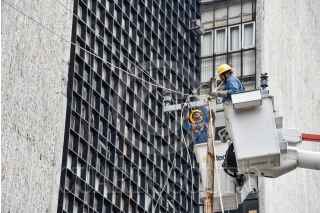 CIUDAD DE MÉXICO, 21SEPTIEMBRE2017.- Continúan las labores de restablecimiento de luz en la colonia Condesa. En la imagen personal de servicio de luz, colocan nuevos cables en los postes entre la avenida Acapulco y Veracruz. FOTO: MARIO JASSO /CUARTOSCURO.COM