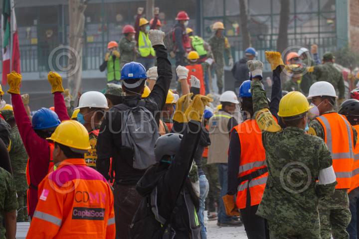 CIUDAD DE MÉXICO, 22SEPTIEMBRE2017.- Sociedad civil, rescatistas y elementos del Ejército terminaron de remover escombros en el edificio que colapsó en la calle de Chimalpopoca, en la colonia Obrera, luego del sismo de 7.1 grados Richter. Elementos del ejército entonaron el himno nacional y guardaron un minuto de silencio al terminar de retirar los escombros. FOTO: ISAAC ESQUIVEL /CUARTOSCURO.COM