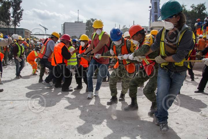 CIUDAD DE MÉXICO, 22SEPTIEMBRE2017.- Sociedad civil, rescatistas y elementos del Ejército terminaron de remover escombros en el edificio que colapsó en la calle de Chimalpopoca, en la colonia Obrera, luego del sismo de 7.1 grados Richter. Elementos del ejército entonaron el himno nacional y guardaron un minuto de silencio al terminar de retirar los escombros. FOTO: ISAAC ESQUIVEL /CUARTOSCURO.COM