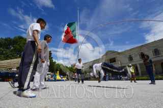 CHILPANCINGO, GUERRERO, 22SEPTIEMBRE2017.- Jóvenes del pentatlón montaron un centro de acopio para los afectados por el sismo de 7.1 grados en la escala de Richter que afecto a la Ciudad de México, el pasado martes. Los pentatlonistas hacen piruetas para atraer a la gente y se anime a donar víveres para los damnificados. FOTO: JOSÉ I. HERNÁNDEZ /CUARTOSCURO.COM