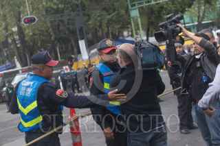 CIUDAD DE MÉXICO, 28SEPTIEMBRE2017.- Elementos de la policía intentan obstruir la toma de un camarográfo en las labores de rescate del edificio colapsado en Álvaro Obregón por el sismo de magnitud de 7.1 del pasado 19 de septiembre. FOTO: TERCERO DÍAZ /CUARTOSCURO.COM