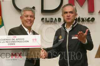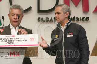CIUDAD DE MÉXICO, 02OCTUBRE2017.- David Penchyna Grub, director del Infonavit, y Miguel Angel Mancera, Jefe de Gobierno, presentaron la estrategia de reconstrucción para la ciudad, luego de los daños que dejó en decenas de edificios el sismo del pasado 19 de septiembre. FOTO: MOISÉS PABLO /CUARTOSCURO.COM
