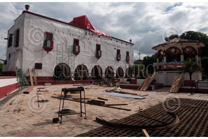 TOTOLAPAN, MORELOS, 03OCTUBRE2017.- Un estanque con cientos de lirios acuáticos junto a un salón de usos múltiples del barrio de San Agustín, que fue afectado por el sismo del pasado 19 de septiembre. FOTO: MARGARITO PÉREZ RETANA /CUARTOSCURO.COM