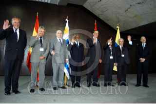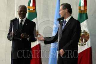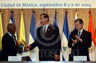 MEXICO, D.F.08SEPTIEMBRE2004.- Vicente Fox Quesada, presidente de la República y Kofi Annan, secretario general de la ONU, estuvieron presentes en la inauguración del seminario internacional Democracia, Política y Estado. En la imagen, se tomaron la foto del recuerdo con Mark Malloch-Brown, administrador de la UPDN, Felipe González, ex-presidente de España, Julio María Sanguinetti, ex-presidente de Uruguay, Valentín Paniagua, ex-presidente de Perú, Belisario Bentacourt, ex-presidente de Colombia y Luis Ernesto Derbez, secretario de Relaciones Exteriores. FOTO: Moisés Pablo/CUARTOSCURO.COM