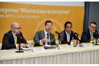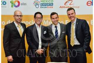 CIUDAD DE MÉXICO, 04OCTUBRE2017.- Xavier Aguirre Rojas, Gerente de Desarrollo de Negocios Latinoamérica de eBay; Paulo Carreño King, director general de ProMéxico; Brian A. Wong, vicepresidente de Grupos Alibaba, y Michael Cuesta, director de Mercadotecnia y Retail UPS México, presentaron el lanzamiento y convenio del modelo de negocios “México Exporta en un click”, el cual permitirá el desarrollo de las micro y pequeñas empresas en el ámbito del comercio electrónico. FOTO: MARIO JASSO /CUARTOSCURO.COM
