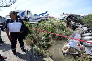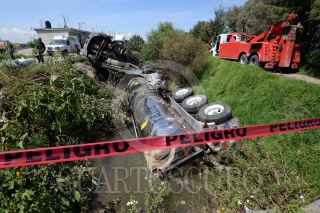 XONACATLAN, ESTADO DE MEXICO, 09OCTUBRE2017.- Una pipa que transportaba aceite para asfalto volcó en un río en la colonia Emiliano Zapata, no se registraron lesionados, el chofer perdió el control de la unidad y terminó en el fondo del río; Protección Civil municipal acordonó la zona para evitar un incidente mayor. FOTO: ARTEMIO GUERRA BAZ / CUARTOSCURO.COM