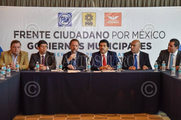 CIUDAD DE MÉXICO, 10OCTUBRE2017.- José Ramón Enríquez Herrera, presidente de la Conferencia Nacional de Municipios de México (CONAMM) y alcalde de Durango; Luis Banck Serrato, presidente Municipal de pueblo, y líderes municipales pertenecientes a los partidos políticos del Frente Ciudadano por México, en conferencia de prensa se manifestaron a favor de una realización transparente para la elección del candidato presidencial que los representará en las elecciones del 2018. FOTO: MARIO JASSO /CUARTOSCURO.COM