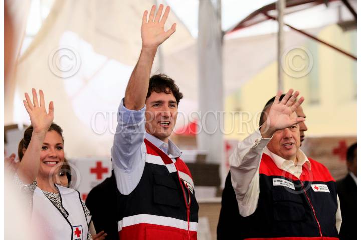 CIUDAD DE MÉXICO, 12OCTUBRE2017.- Sophie Grégoire, esposa del primer ministro canadiense Justin Trudeau; Justin Trudeau, primer ministro canadiense, y Fernando Suinaga Cárdenas, presidente de Cruz Roja Mexicana, durante la entrega de una despensa y banderazo de salida humanitaria para los damnificados de los sismos del 7 y 19 de septiembre. FOTO: GALO CAÑAS /CUARTOSCURO.COM