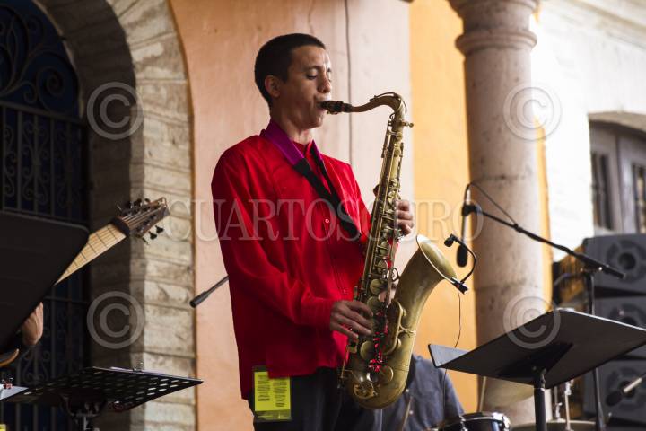 GUANAJUATO, GUANAJUATO, 20OCTUBRE2017.- La banda de jazz Hugo Fernández Quartet se presentó en la Ex Hacienda de San Gabriel Barrera, dentro del programa musical del 45 Festival Internacional Cervantino. Hugo Fernández, Diego Franco, Jorge Servín y Miguel Rodríguez ejecutaron diversos ritmos, terminaron jazzeando "México Lindo y Querido", para ellos el tocar es algo tan sencillo com "Círculos y Triángulos", que ha decir de su líder es como un resumen de la historia de todos los pueblos en el mundo, ya que estas figuras se encuentran en todas las culturas. FOTO: MOISÉS PABLO /CUARTOSCURO.COM