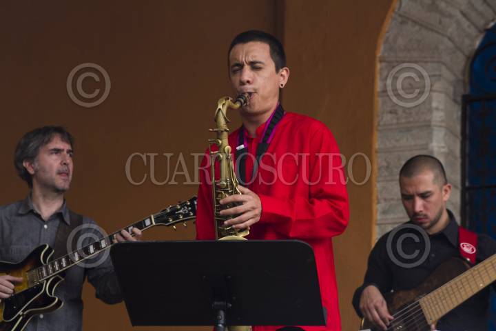 GUANAJUATO, GUANAJUATO, 20OCTUBRE2017.- La banda de jazz Hugo Fernández Quartet se presentó en la Ex Hacienda de San Gabriel Barrera, dentro del programa musical del 45 Festival Internacional Cervantino. Hugo Fernández, Diego Franco, Jorge Servín y Miguel Rodríguez ejecutaron diversos ritmos, terminaron jazzeando "México Lindo y Querido", para ellos el tocar es algo tan sencillo com "Círculos y Triángulos", que ha decir de su líder es como un resumen de la historia de todos los pueblos en el mundo, ya que estas figuras se encuentran en todas las culturas. FOTO: MOISÉS PABLO /CUARTOSCURO.COM