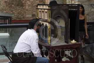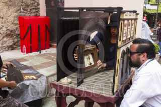 GUANAJUATO, GUANAJUATO, 20OCTUBRE2017.- La compañía La Cumbancha Música y Escena presentó la obra "La Constitución de 1917 a través de la mirilla", en el exterior del Teatro Juárez. Esta propuesta de teatro callejero se basa en que sea un solo espectador el que aprecia la puesta en escena. FOTO: MOISÉS PABLO /CUARTOSCURO.COM