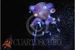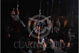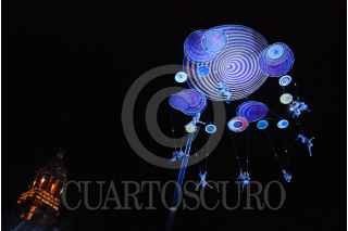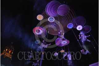 ZACATECAS, ZACATECAS, 21OCTUBRE2017.- La noche de ayer se presento en la Plaza de Armas de la capital del estado el grupo Voalá Project & Duchamp Pilot. España con la obra The Muaré Experience. Muaré es un espectáculo de teatro aéreo, en el que bailarines, escaladores, actores y acróbatas tienen el cielo como escenario. Es un intercambio de intensidades entre el campo musical y visual. FOTO: CARLOS SEGURA /CUARTOSCURO.COM
