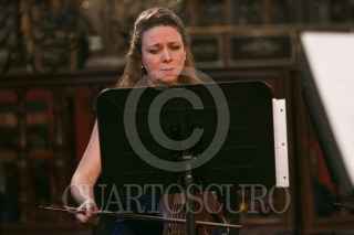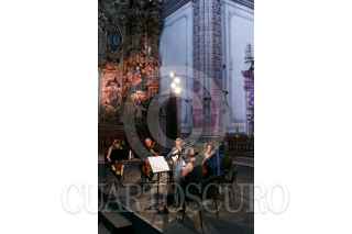GUANAJUATO, GUANAJUATO, 22OCTUBRE2017.- La compañía Les Voix Humaines Consort conformada por Mélisande Corriveau, Margaret Little, Félix Deak, Rafael Sánchez Guevara, Susana Napper en las violas da gamba y Níger North en el laúd, presentaron su espectáculo Guerras y Lágrimas (Wars & Tears), en el Templo de la Valenciana. Esta agrupación abre con Lacrimea o Seaven Tears (siete lágrimas) del compositor John Dowland, que se publicó en Londres en 1604 y está dedicada a Ana de Dinamarca. Lex Vois Humaines está compuesto por cinco violas de diferentes tamaños, en esta ocasión los acompaña en el laúd de Níger North. Este recital forma parte de la música de cámara del 45 Festival Internacional Cervantino. FOTO: MOISÉS PABLO /CUARTOSCURO.COM
