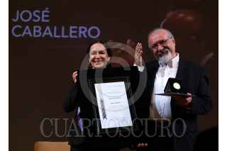 CIUDAD DE MÉXICO, 23OCTUBRE2017.- José Caballero, director de escena, dramaturgo y pedagogo, recibió en la sala Manuel M. Ponce de manos de Lidia Camacho, directora del INBA, la Medalla Bellas Artes por sus aportaciones al arte y cultura del país. FOTO: ADOLFO VLADIMIR /CUARTOSCURO.COM