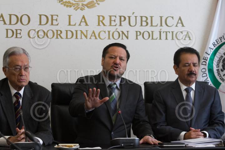 CIUDAD DE MÉXICO, 24OCTUBRE2017.- Los coordinadores parlamentarios Manuel Bartlett (PT); Luis Sánchez (PRD), y Fernando Herrera (PAN), ofrecieron una conferencia de prensa tras concluir una reunión de la Junta de Coordinación Política del Senado, en donde se discutió el formato de la reunión de trabajo con Santiago Nieto, titular de la Fepade, quien fue removido por el encargado de despacho de la PGR, Alberto Elías Beltrán, para el día de mañana. FOTO: MOISÉS PABLO /CUARTOSCURO.COM