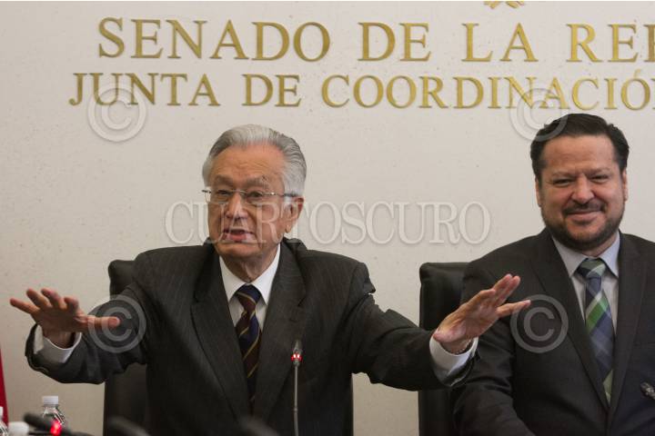 CIUDAD DE MÉXICO, 24OCTUBRE2017.- Los coordinadores parlamentarios Manuel Bartlett (PT); Luis Sánchez (PRD), y Fernando Herrera (PAN), ofrecieron una conferencia de prensa tras concluir una reunión de la Junta de Coordinación Política del Senado, en donde se discutió el formato de la reunión de trabajo con Santiago Nieto, titular de la Fepade, quien fue removido por el encargado de despacho de la PGR, Alberto Elías Beltrán, para el día de mañana. FOTO: MOISÉS PABLO /CUARTOSCURO.COM