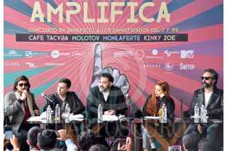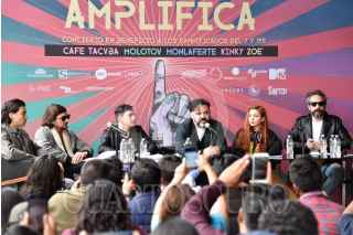CIUDAD DE MÉXICO, 25OCTUBRE2017.- Las agrupaciones musicales Café Tacvba, Molotov, Mon Laferte Kinky y Zoé, anunciaron su participación en el concierto “Amplifica” que se realizará en beneficio a los damnificados de los sismo del 7 y 19 de septiembre. El concierto se llevará a cabo el miércoles 1 de noviembre en el Palacio de Deportes. En la imagen Léon Laguerri, Gil Cerezo, Enrique Rangel, Mon Laferte y Tito Fuentes. FOTO: MARIO JASSO /CUARTOSCURO.COM