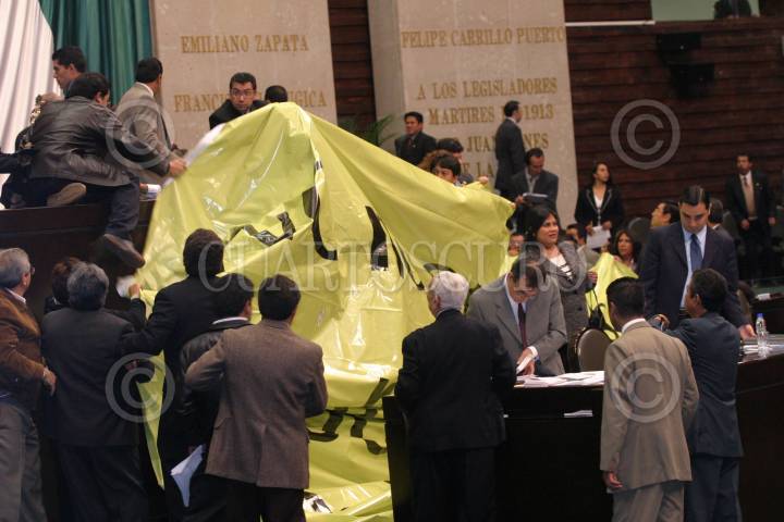 México, D.F. 05 OCTUBRE 2004.- Luego de que el grupo de asambleistas ingresó al area de visatas del recinto de San Lázaro, la brincaron y se dirigieron a la tribuna para colocar la manta de protesta a la reforma al artículo 122 constitucional. FOTO: Sandra Perdomo/CUARTOSCURO.COM