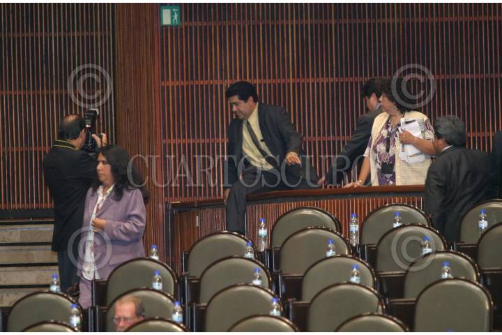 México, D.F. 05 OCTUBRE 2004.- Luego de que el grupo de asambleistas ingresó al area de visatas del recinto de San Lázaro, la brincaron y se dirigieron a la tribuna para colocar la manta de protesta a la reforma al artículo 122 constitucional. FOTO: Sandra Perdomo/CUARTOSCURO.COM