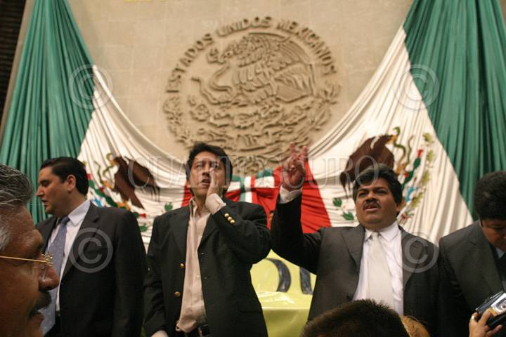 México, D.F. 05 OCTUBRE 2004.- Protesta de asambleistas del PRD en el recinto de San Lázaro para impedir que se apruebe la reforma al artículo 122 constitucional. Congestionamiemto de reporteros y diputados en la tribuna. FOTO: Sandra Perdomo/CUARTOSCURO.COM