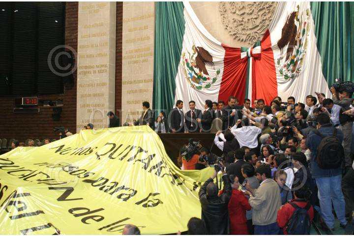 México, D.F. 05 OCTUBRE 2004.- Protesta de asambleistas del PRD en el recinto de San Lázaro para impedir que se apruebe la reforma al artículo 122 constitucional. Congestionamiemto de reporteros y diputados en la tribuna. FOTO: Sandra Perdomo/CUARTOSCURO.COM