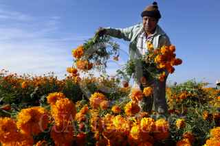 NEALTICAN, PUEBLA; 28OCTUBRE2017.- NEALTICAN, PUEBLA, 29OCTUBRE2015.- Cinco familias enteras, laboran en la corta de flor de cempasúchil en un campo ubicado a las faldas del volcán Popocatépetl; con jornadas de 12 y hasta 16 horas de trabajo ininterrumpidas logran la recolección de la tradicional flor para transportarla y comercializarla en la central de abastos y mercados locales. La flor de cempasúchil se utiliza principalmente como decoración y ofrenda ritual en el Día de Muertos. Es habitual utilizar los pétalos para marcar en el suelo el camino que deben seguir las almas de los difuntos hacia los altares domésticos levantados en su honor; puesto que según las creencia su particular olor es la guía a seguir. FOTO: HILDA RÍOS /CUARTOSCURO.COM