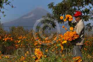 NEALTICAN, PUEBLA; 28OCTUBRE2017.- NEALTICAN, PUEBLA, 29OCTUBRE2015.- Cinco familias enteras, laboran en la corta de flor de cempasúchil en un campo ubicado a las faldas del volcán Popocatépetl; con jornadas de 12 y hasta 16 horas de trabajo ininterrumpidas logran la recolección de la tradicional flor para transportarla y comercializarla en la central de abastos y mercados locales. La flor de cempasúchil se utiliza principalmente como decoración y ofrenda ritual en el Día de Muertos. Es habitual utilizar los pétalos para marcar en el suelo el camino que deben seguir las almas de los difuntos hacia los altares domésticos levantados en su honor; puesto que según las creencia su particular olor es la guía a seguir. FOTO: HILDA RÍOS /CUARTOSCURO.COM