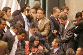 MEXICO D.F. 07OCTUBRE2004.- Durante la sesión en el recinto de San Lazaro, los diputados del PRD tomaron la tribuna de la camara diputados, para evitar la primera lectura de la propuesta de modificación del articulo 122 constitucional. Manlio Fabio Beltrones es rodeado por personal de seguridad para salir del sal;on de plenos. FOTO: Germán Romero/CUARTOSCURO.COM