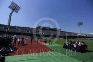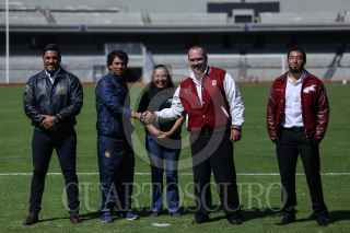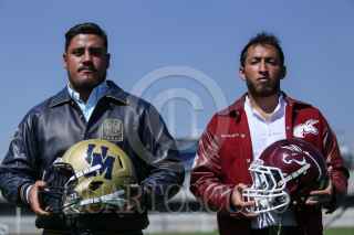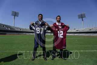 CIUDAD DE MÉXICO, 08NOVIEMBRE2017.- Abraham Herrera, capitán de Pumas CU y Marcos Suaste, receptor de Burros Blancos, durante la conferencia para hablar del próximo encuentro de semifinal de la Organización Nacional Estudiantil de Fútbol Americano (ONEFA) y clásico nacional, Pumas y Politécnico. FOTO: ADOLFO VLADIMIR /CUARTOSCURO.COM