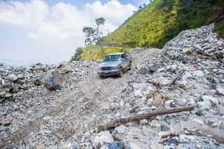SANTA MARGARITA HUITEPEC, OAXACA, 11NOVIEMBRE2017.- Un auto transita por el camino en pésimo estado hacia la comunidad de la sierra baja mixe, afectada por los sismo del pasado mes de septiembre en el país. El pueblo ha recolectado grandes piedras blancas para reforzar sus paredes, ha colocado troncos en las bardas en vertical y diagonal para evitar colapsos latentes. Asimismo, la carretera de terracería -que es la principal conexión de esta región con otros municipios- quedó gravemente afectada por los deslaves que ocasionaron los temblores, lo cual, aunado a las fuertes lluvias, ha ocasionado problemas de movilidad para adquirir alimentos y otros bienes necesarios. De acuerdo con la comunidad, Adolfo Reyes Peralta, presidente del municipio San Miguel Quetzaltepec, al cual pertenecen, no ha acudido a la zona afectada en la que viven. Aseguran no haber recibido apoyo a la fecha por parte de las autoridades de los tres niveles de gobierno. Los pobladores comentaron que, por no ser un destino turístico, no figuran en la agenda política del estado y la federación. Este es uno de los poblados más marginados en Oaxaca, y su subsistencia se basa en la producción de frijol, maíz, huevo y pollos, para su propia alimentación. FOTO: TERCERO DÍAZ /CUARTOSCURO.COM