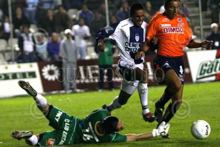 PACHUCA, HIDALGO , 27 OCTUBRE 2004.-P Miguel Herrera director tecnico de los Rayados del Monterrey es acompañado por un elemento de seguridad despues de reglamar una judaga fue expulsado del partidode Pachuca contra al Monterrey. FOTO: Eunice Adorno\CUARTOSCURO.COM