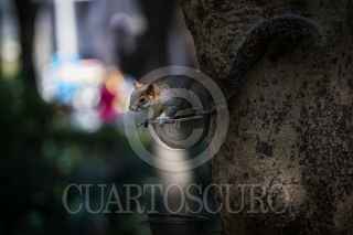 CIUDAD DE MÉXICO, 22NOVIEMBRE2017.- Una ardilla busca comida en uno de los recipientes que se colocaron en los árboles del Parque de San Lorenzo, en la colonia Del Valle. . FOTO: ISAAC ESQUIVEL /CUARTOSCURO.COM