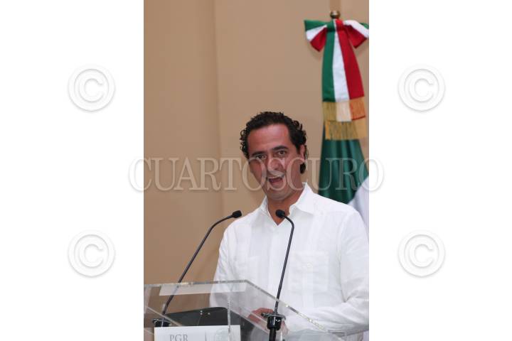 CANCÚN, QUINTANA ROO, 22NOVIEMBRE2017.- Alberto Elías Beltrán, subprocurador Jurídico y de Asuntos Internacionales de la PGR, e Israel Lira Salas, titular de la Subprocuraduría Especializada en Investigación de Delincuencia Organizada (SEIDO), ofrecieron una conferencia de prensa sobre el caso de las cajas de First National Security (FNS). FOTO: CUARTOSCURO.COM