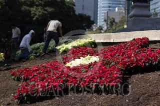 CIUDAD DE MÉXICO, 23NOVIEMBRE2017.- Continúa la plantación de noche buenas sobre Paseo de la Reforma con motivo de las próximas fiestas decembrinas. En la imagen, trabajadores instalan la flor en la glorieta del Ángel de la Independencia. FOTO: GALO CAÑAS /CUARTOSCURO.COM
